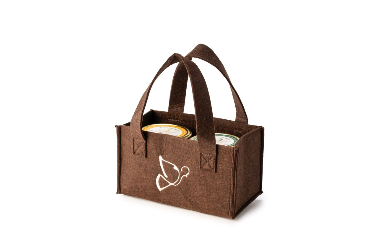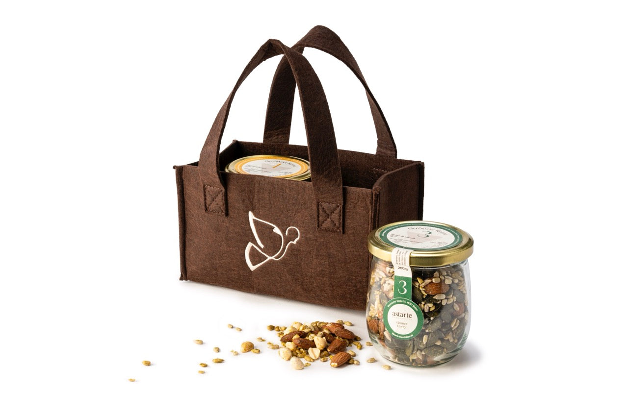 Verschenken Sie eine nette Filztasche mit unserer darauf gestickten Taube. Das Tascherl bietet Platz für 2 x 200g  Gläser der gerösteten Kernmischungen.